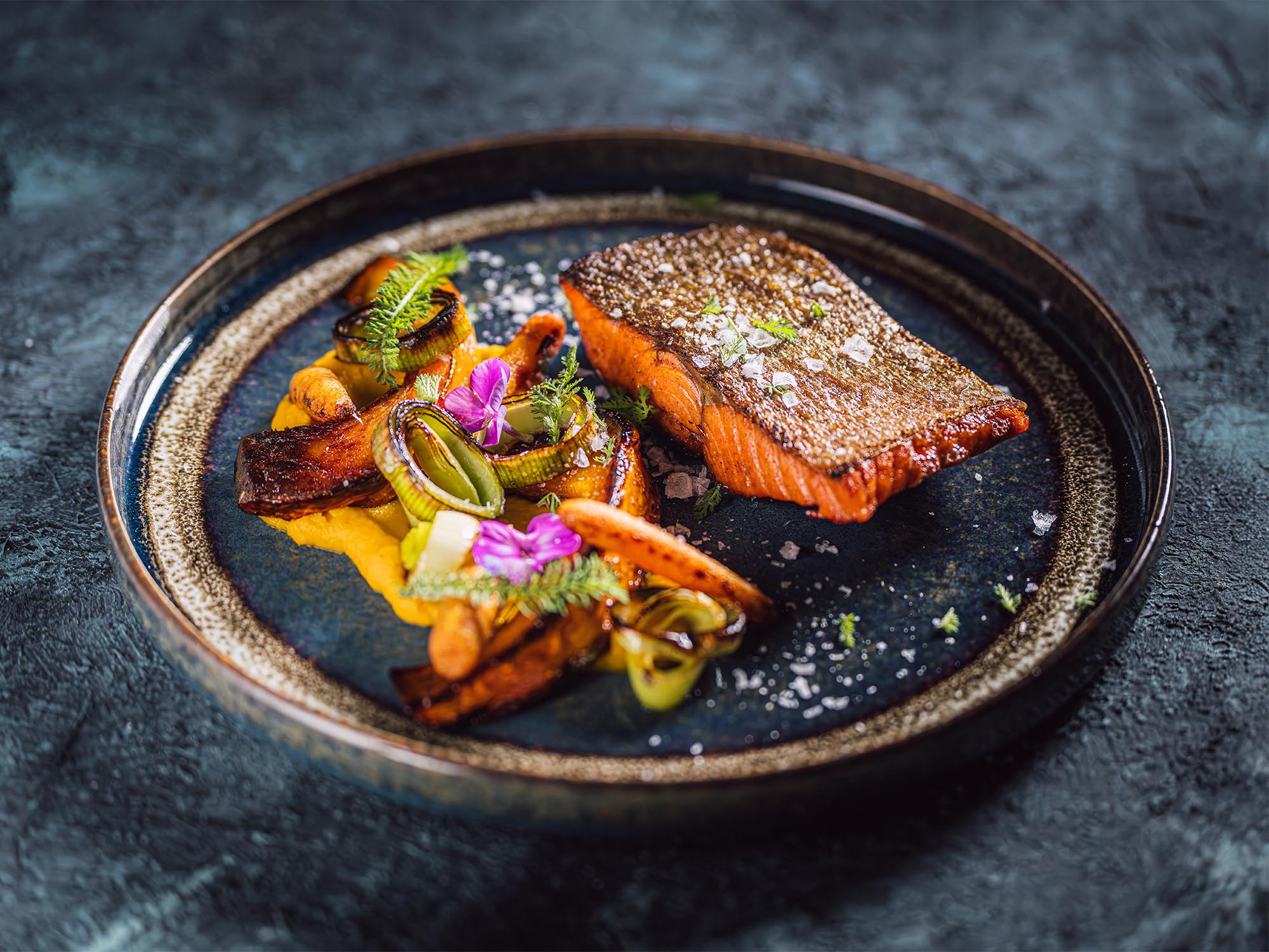 Netradiční kombinace asijských chutí, fermentovaného fenyklu a křupavé kůže z lososa.