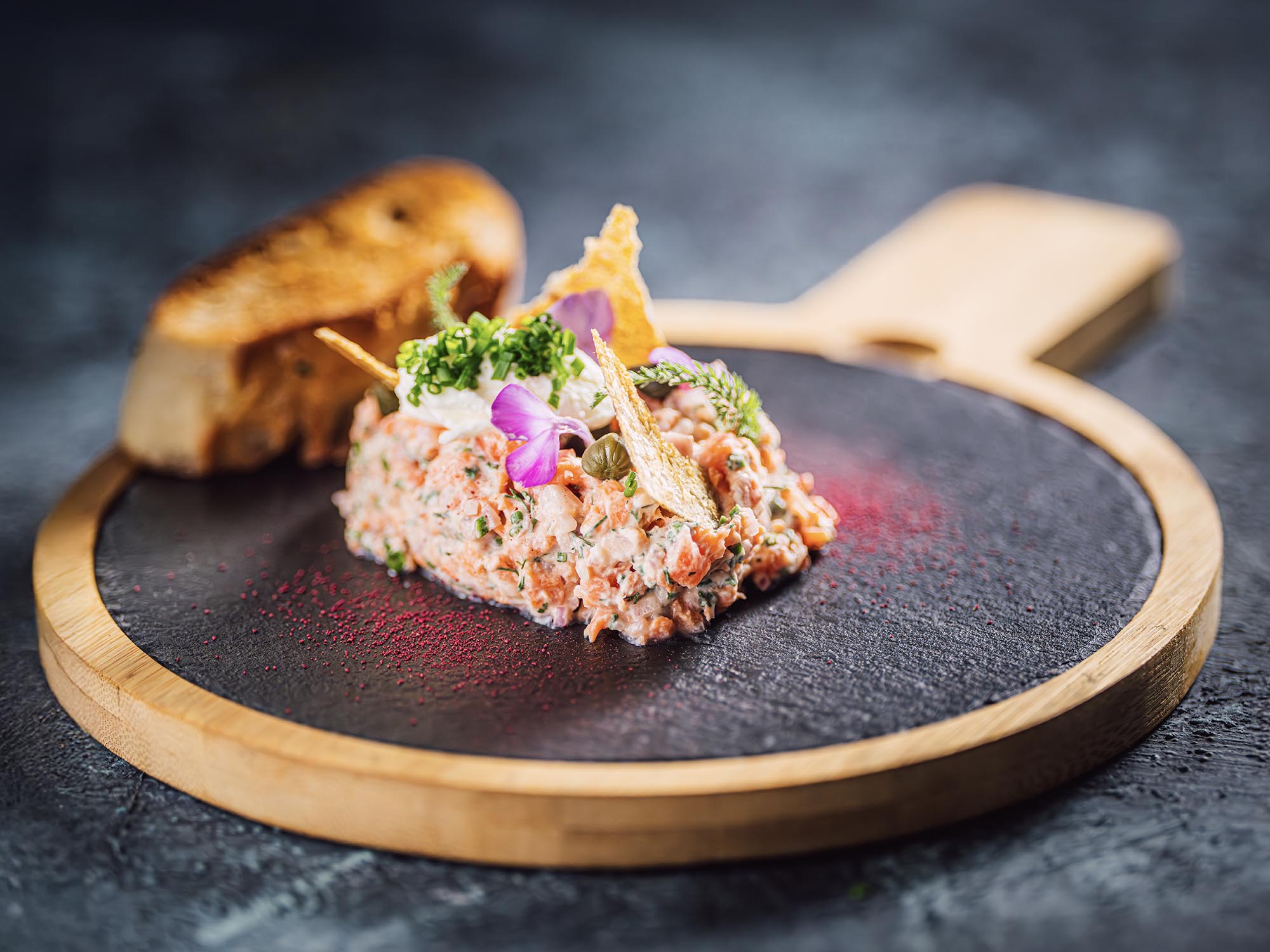 Tatarák z čerstvého divokého lososa z Aljašky je lehký, svěží a elegantní předkrm, který vynikne díky kombinaci citronu, kaparů a bylinek. Jemnost ryby doplňuje zakysaná smetana a křupavá bagetka s česnekovým máslem.